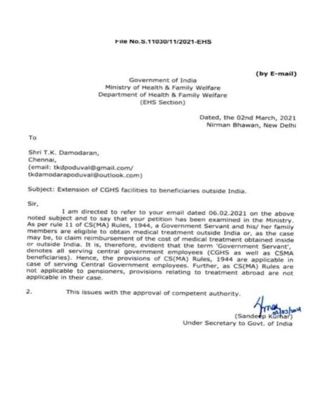 I am directed to refer to your email dated 06.02.2021 on the above noted subject and to say that your petition has been examined in the Ministry. As per rule 11 of CS(MA) Rules, 1944, a Government Servant and his/ her family members are eligible to obtain medical treatment outside India or, as the case may be, to claim reimbursement of the cost of medical treatment obtained inside or outside India. It is, therefore, evident that the term ‘Government Servant’, denotes all serving central government employees (CGHS as well as CSMA beneficiaries). Hence, the provisions of CS(MA) Rules, 1944 are applicable in case of serving Central Government employees. Further, as CS(MA) Rules are not applicable to pensioners, provisions relating to treatment abroad are not applicable in their case.