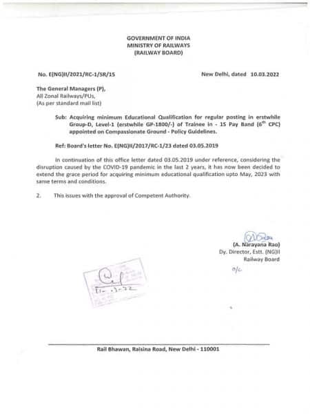In continuation of this office letter dated 03.05.2019 under reference, considering the disruption caused by the COVID-19 pandemic in the last 2 years, it has now been decided to extend the grace period for acquiring minimum educational qualification upto May, 2023 with same terms and conditions.