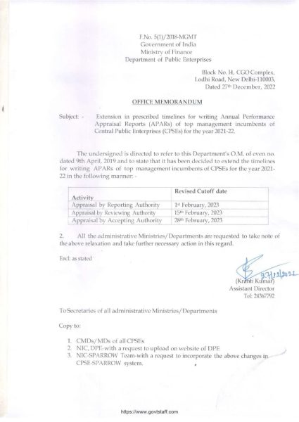 The undersigned is directed to refer to this Department’s O.M. of even no. dated 9th April, 2019 and to state that it has been decided to extend the timelines for writing APARs of top management incumbents of CPSEs for the year 2021-22 in the following manner: –