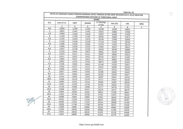 OROP-2 Pension Table-23 for Commissioned Officers of the Territorial Army : Effective from 01.07.2019
