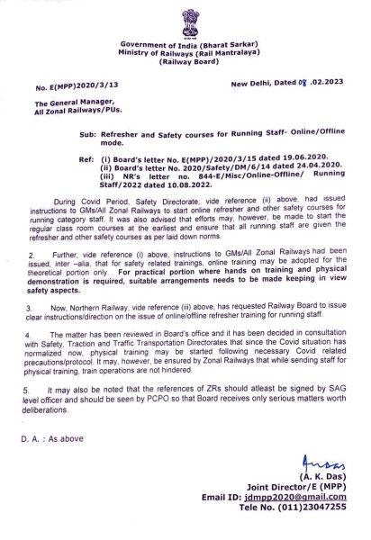 Refresher and Safety courses for Running Staff- Online/Offline mode: Railway Board Order to resume physical training vide dated 08.02.2023