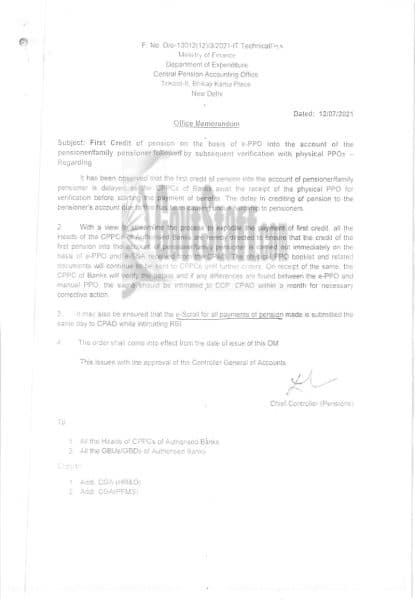 It is observed that the banks are not following the CPAO’s OM dated 12.07.2021 which is causing hardship to the pensioners/family pensioners. It is once again directed to diligently follow CPAO’s instructions and credit the first pension on the receipt of the e-PPO.