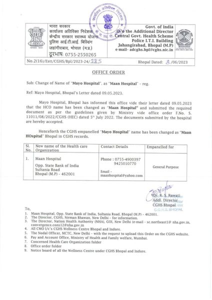 Mayo Hospital, Bhopal has informed this office vide their letter dated 09.05.2023 that the HCO name has been changed as “Maan Hospital” and submitted the required document as per the guidelines given by Ministry vide office order F.No. S. 11011/08/2022/CGHS (HEC) dated 5th July 2022. The documents submitted by the hospital are hereby accepted.