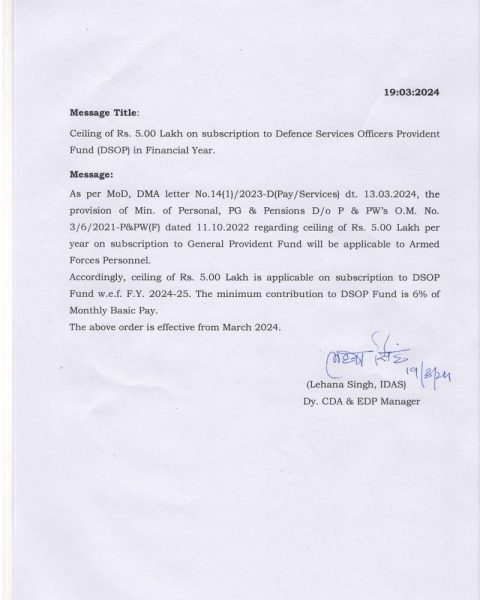 Applicability of ceiling of Rs. 5.00 Lakh on subscription to Defence Services Officers Provident Fund (DSOP) w.e.f. Financial Year 2024-25: PCDA(O) Message dated 19.03.2024