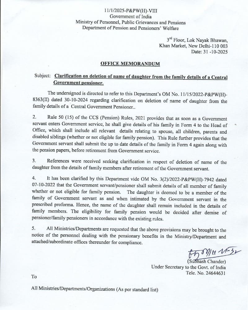 The undersigned is directed to refer to this Department’s OM No. 11/1 5/2022-P&PW(H)-8363(H) dated 30-10-2024 regarding clarification on deletion of name of daughter from the family details of a Central Government Pensioner..