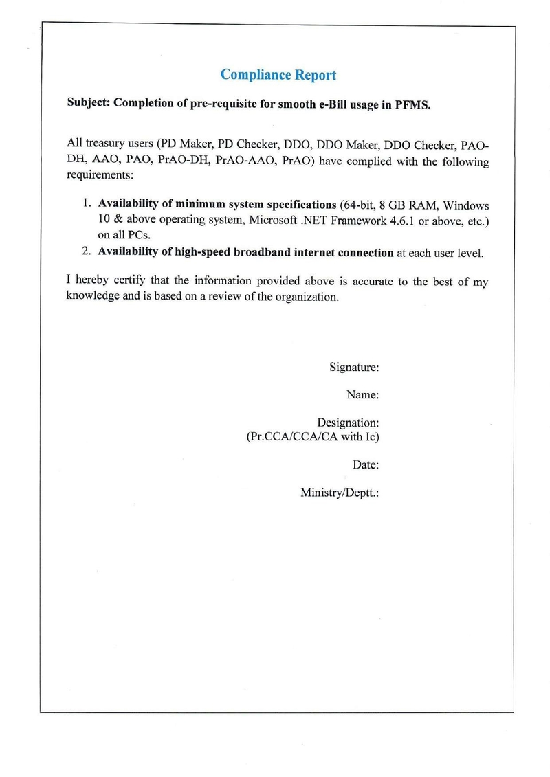 Sub: Compliance of completion of pre-requisites for smooth e-bill usage in PFMS.