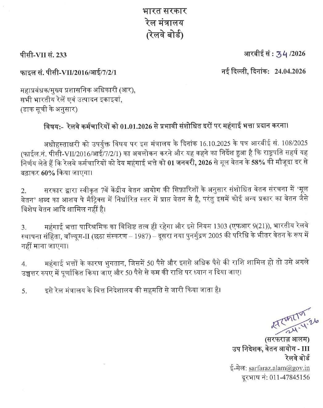 The undersigned is directed to refer to this Ministry’s letter RBE No. 108/2025 dated 16.10.2025 (F.No. PC-VII/2016/I/7/2/1) on the subject mentioned above and to say that the President is pleased to decide that the Dearness Allowance payable to Railway employees shall be enhanced from the existing rate of 58% to 60% of the Basic Pay with effect from 1st January, 2026.