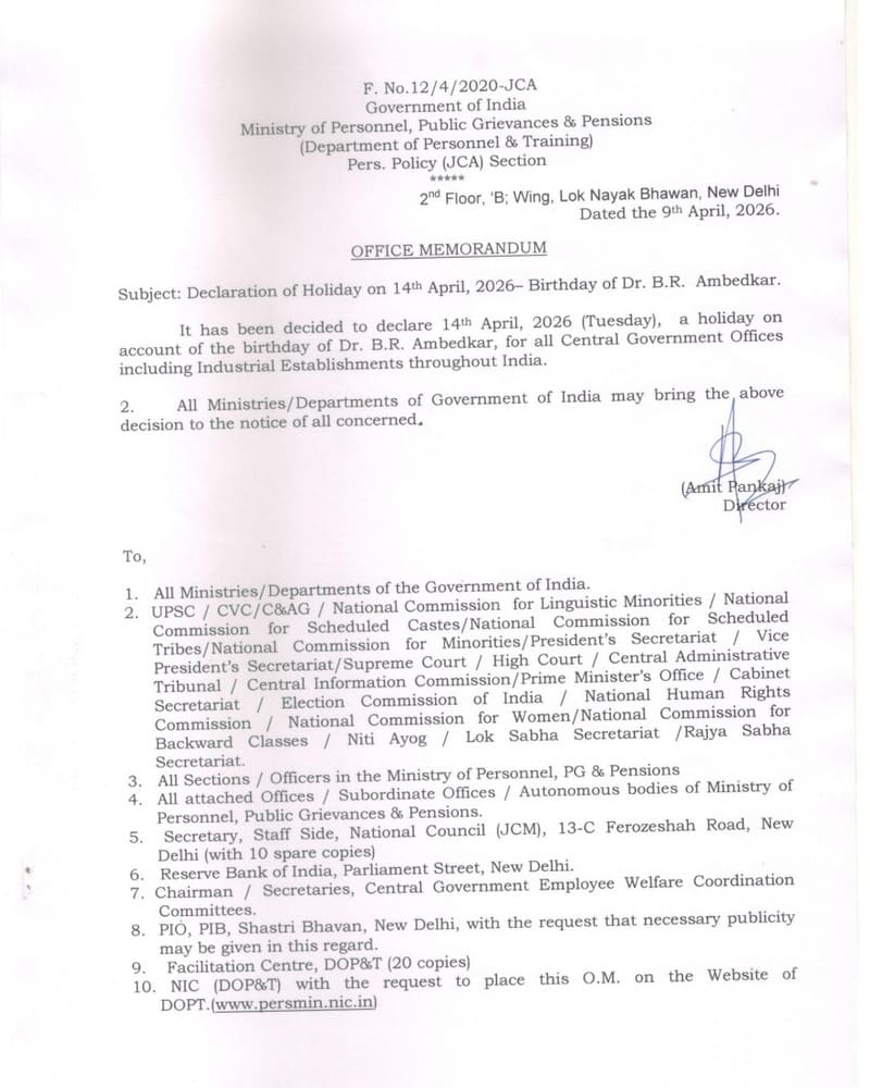 It has been decided to declare 14th April, 2026 (Tuesday), a holiday on account of the birthday of Dr. B.R. Ambedkar, for all Central Government Offices including Industrial Establishments throughout India.
